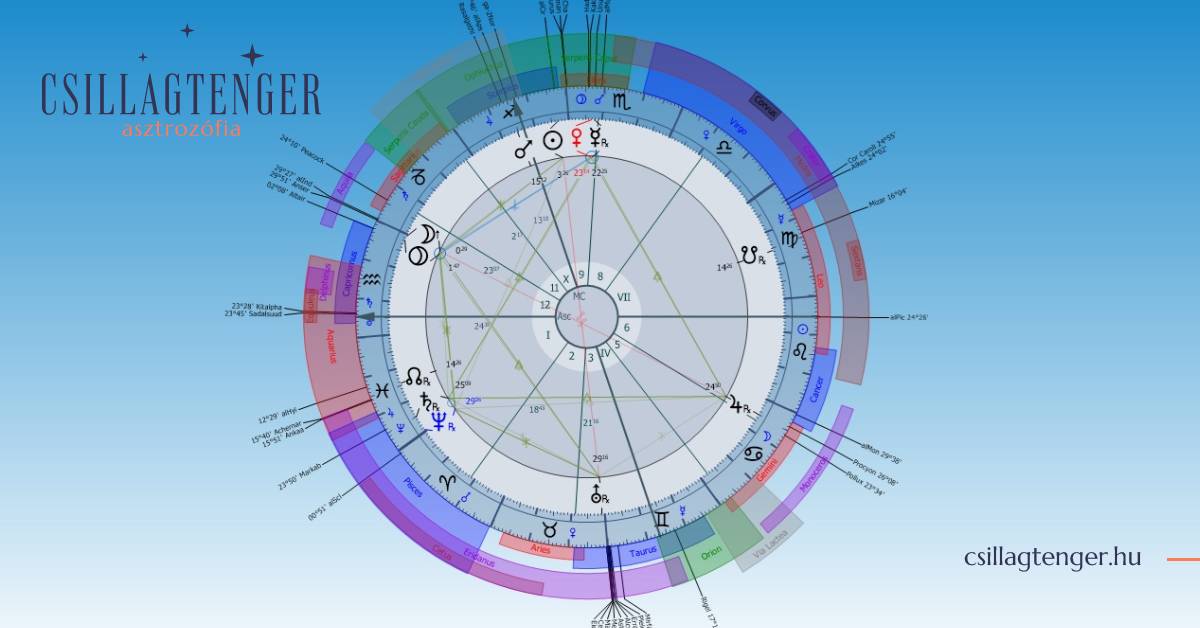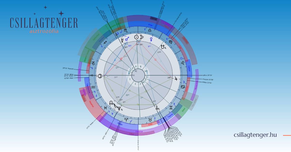 Újhold az Angyalban, születése pillanatában fent az ég tetején. Varázslat. Angyali énünkre való ébredés. Ez már önmagában egy kiemelkedés. És mindez az ASC-DSC-en álló Plútóval és Jupiterrel kvadrátban, amiben ott a teljes kiteljesedés és valódi öntudatunkra ébredés lehetősége. Plútó által felismerhetjük valódi varázserőinket, Jupiterrel pedig eredeti önmagunkat. Ebben az az igazi csoda, hogy közben Plútó